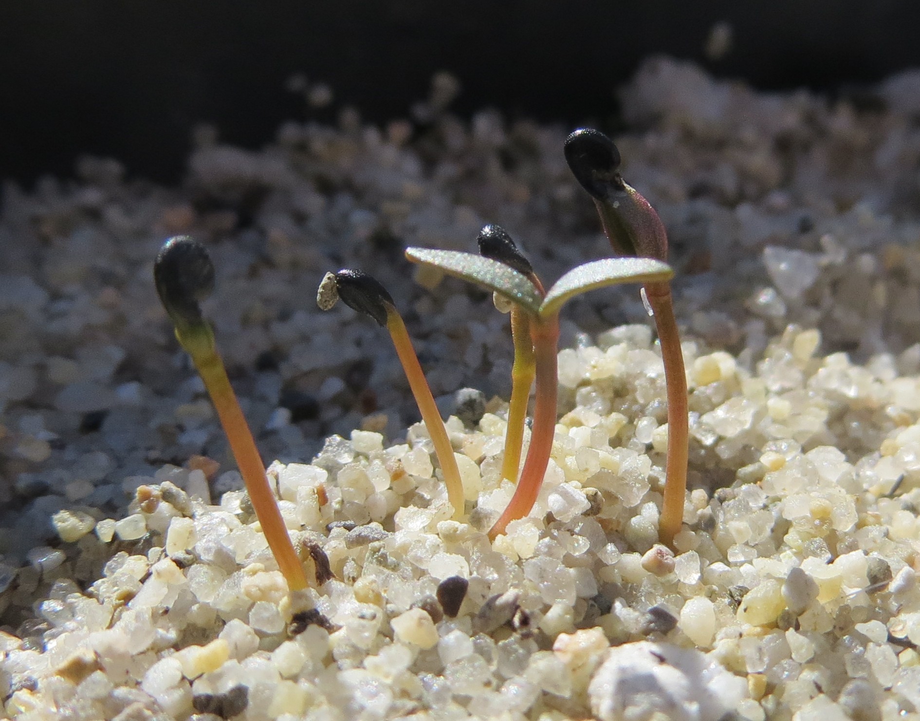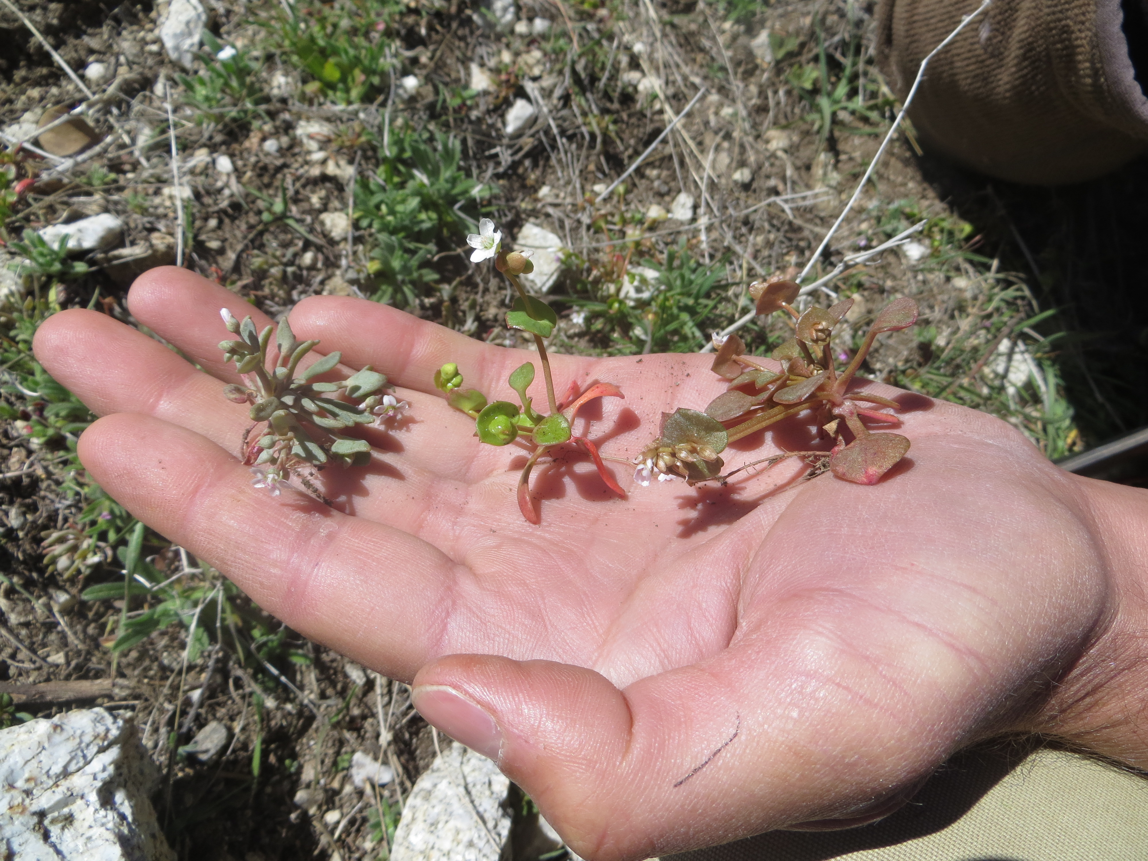 For example, the plants photographed above demonstrate another conspicuous characteristic of most lineages of Claytonia rubra — betalain pigmentation is generally evident on the abaxial (lower) surfaces of the basal (and sometimes cauline) leaves, giving them a purple/reddish appearance. This is a sort of ‘no-brainer’ character I tend to point people towards, but just as with the characteristic basal leaf orientation I mentioned above, this morphological character doesn’t always hold true. Plants love exceptions WAY MORE than rules: in this particular case there appears to be an environmental element to variation in Claytonia betalain pigmentation, as evidenced by some unpublished observations I have made in common garden experiments involving C. perfoliata, C. rubra, and some perennials in the C. “peirsonii” complex.