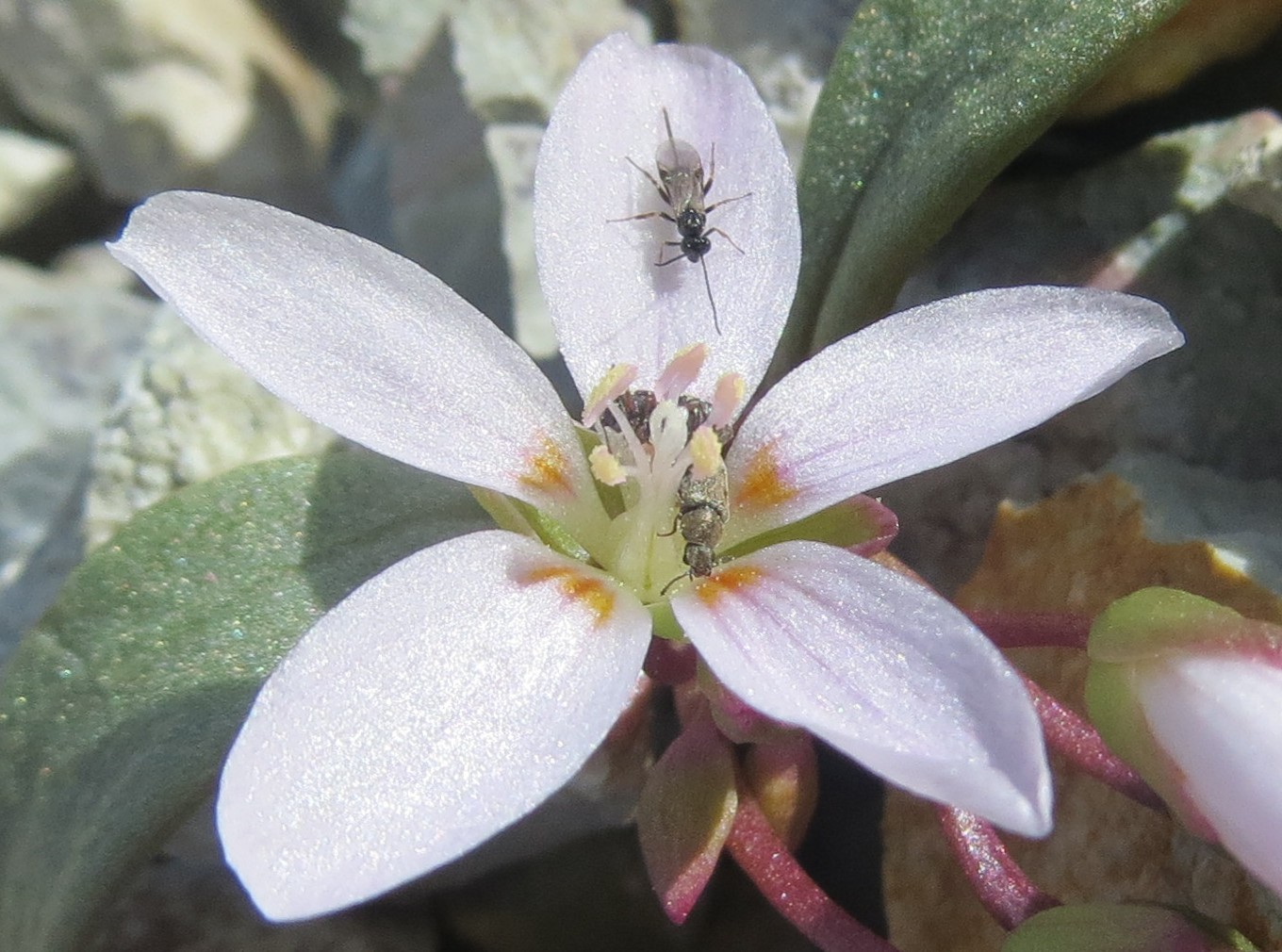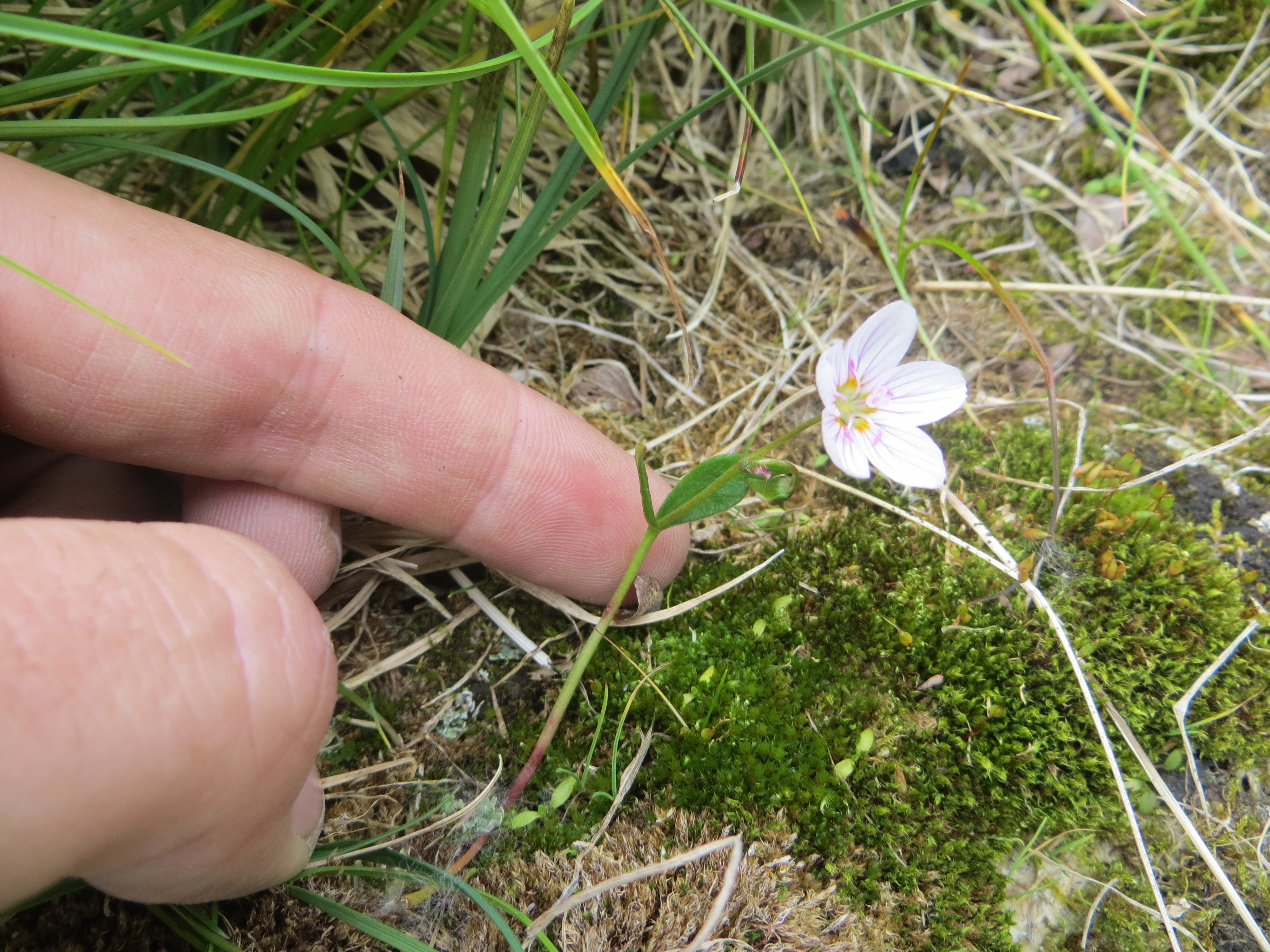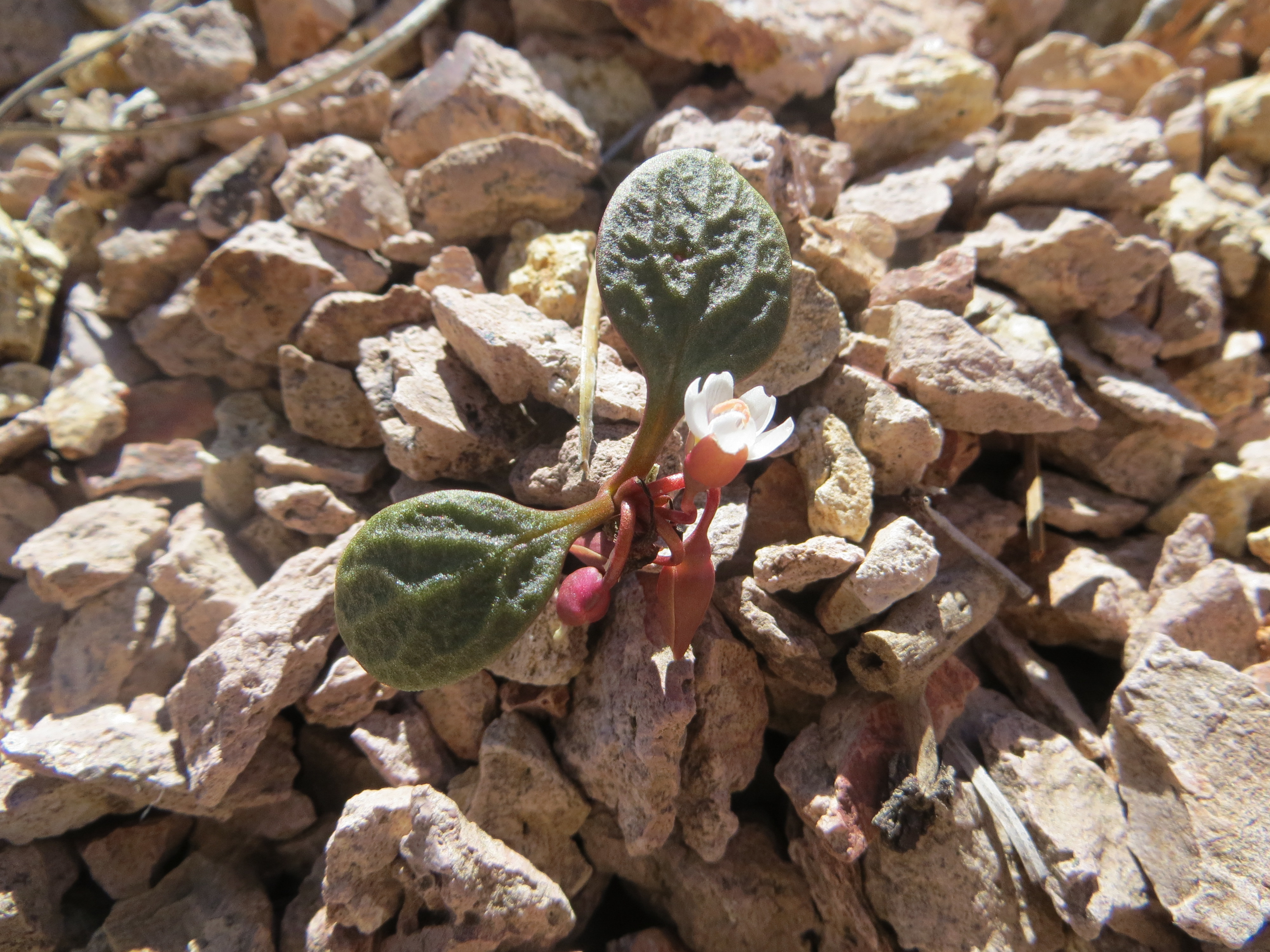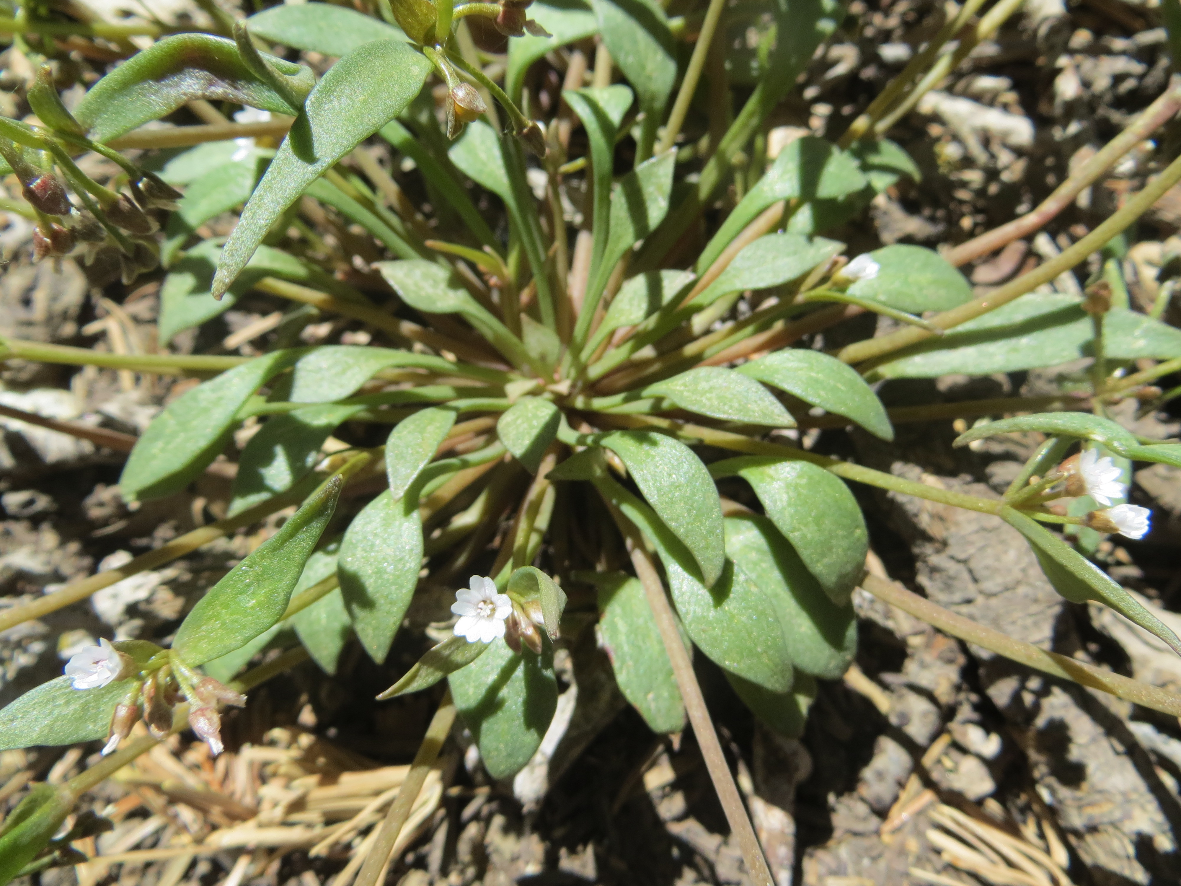 Claytonia rubra photographed while flowering on the Modoc Plateau, northern California. Notice the largest leaf blades (outermost in the rosette) are among the first to have emerged in early development — These lay flat on the ground surface (or nearly so)