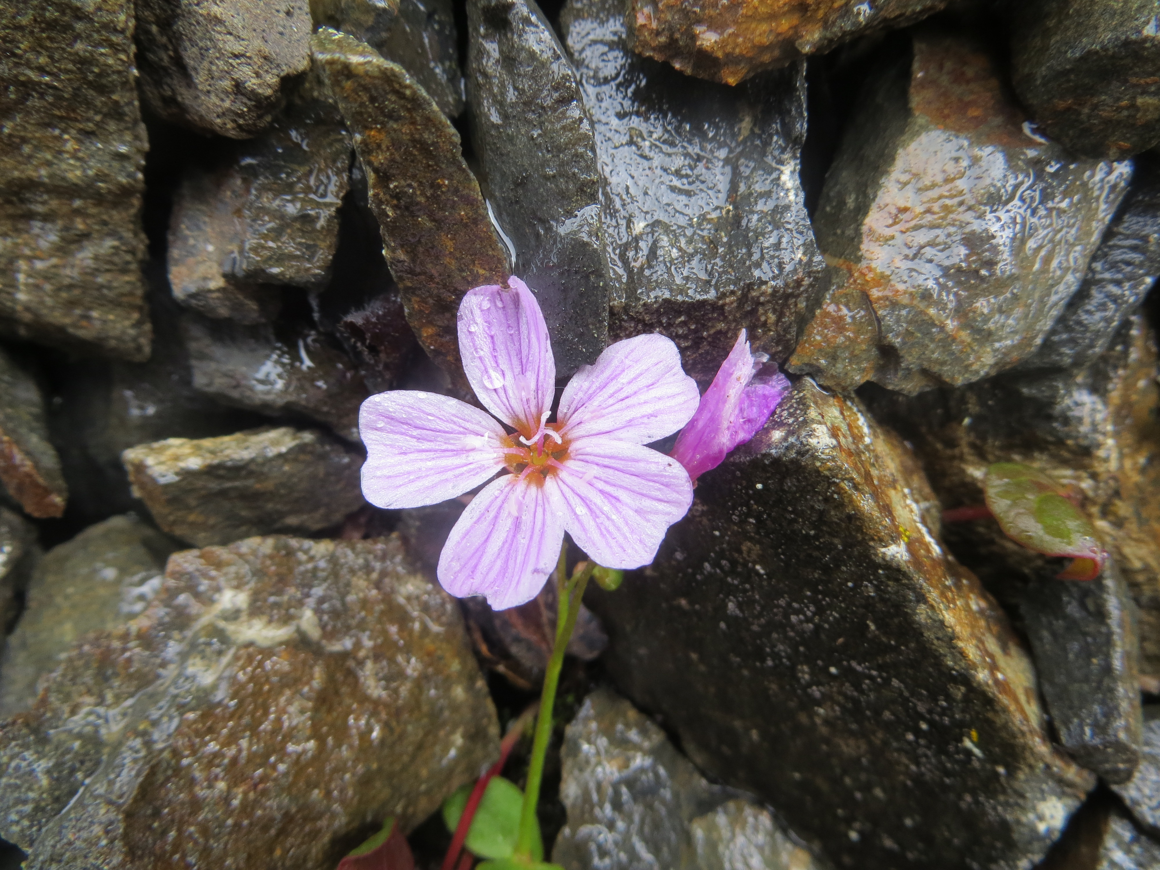 The characteristic of Claytonia rubra have low-growing leaves seems pretty useful, until you come across a putative lineage (sometimes in the same mountain range!) that looks like the plant below — these plants have distinctly erect / ascending leaves, although the proximal portion of their petioles are still appressed to the ground. This gives the leaves a sort of ‘S-curved’ look. Believe it or not, these are another subspecies of Claytonia rubra!