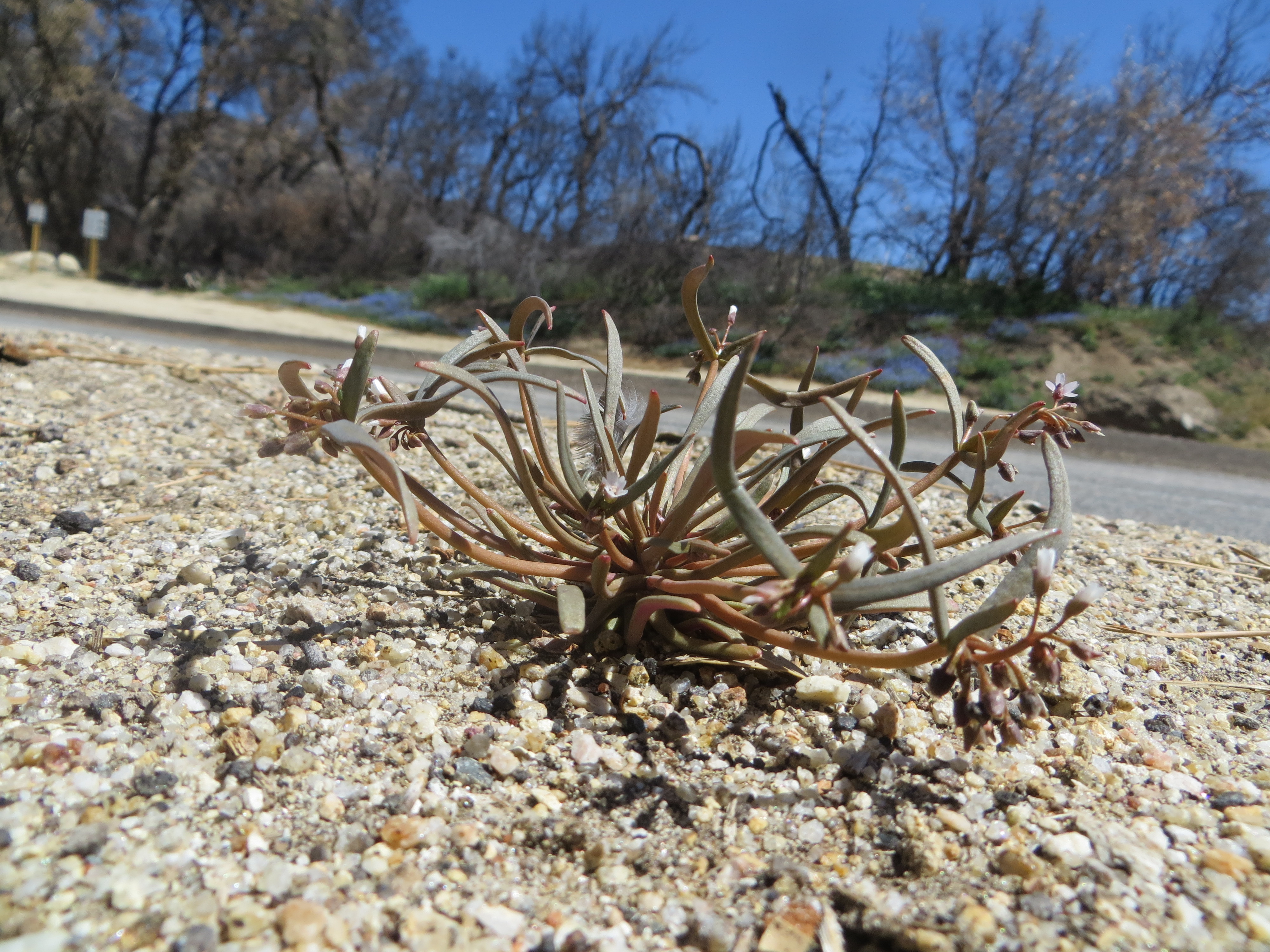 Starting with identification, something I’ve found to be fairly characteristic of Claytonia rubra is that its older leaves (outermost in the rosette of basal leaves), which often have the largest blades, tend to lay flat on the ground — some close relatives (like certain subspecies of C. perfoliata) do this too, or something like it, so don’t take this for a smoking gun. Furthermore, some races of C. rubra do not have basal rosettes that lay flat, rather they are elevated ever so slightly above the forest floor. Don’t you just love those kinds of dichotomous key breaks? — Is is erect to ascending (sometimes spreading), or ascending to spreading (sometimes erect)?! — Still, if you see something in the mountains of western North America like in the picture below, where the outermost (older) leaves in the basal rosette lay flat, appressed to the ground, you can be fairly confident that you are looking at something that is quite appropriately called Claytonia rubra.