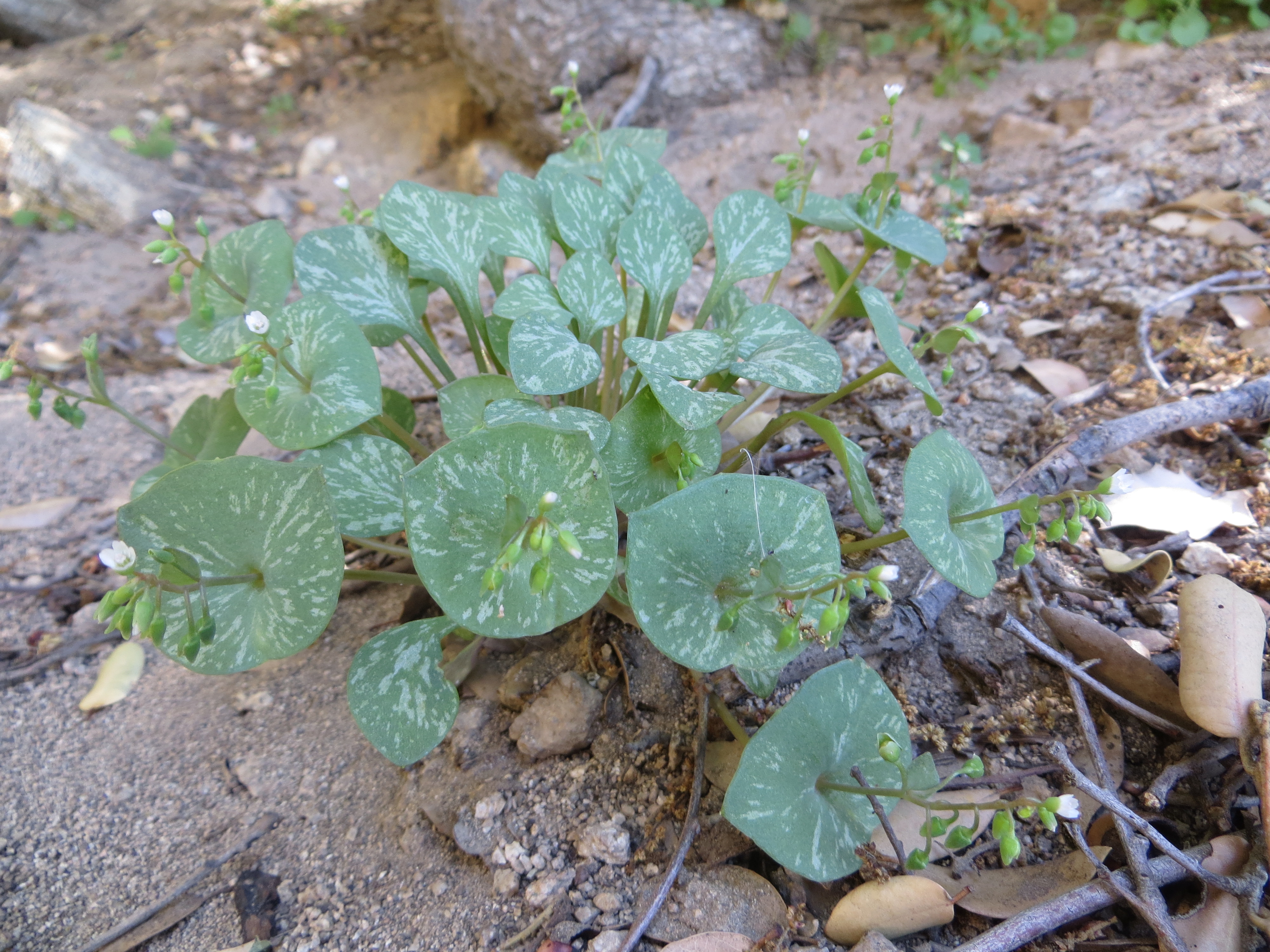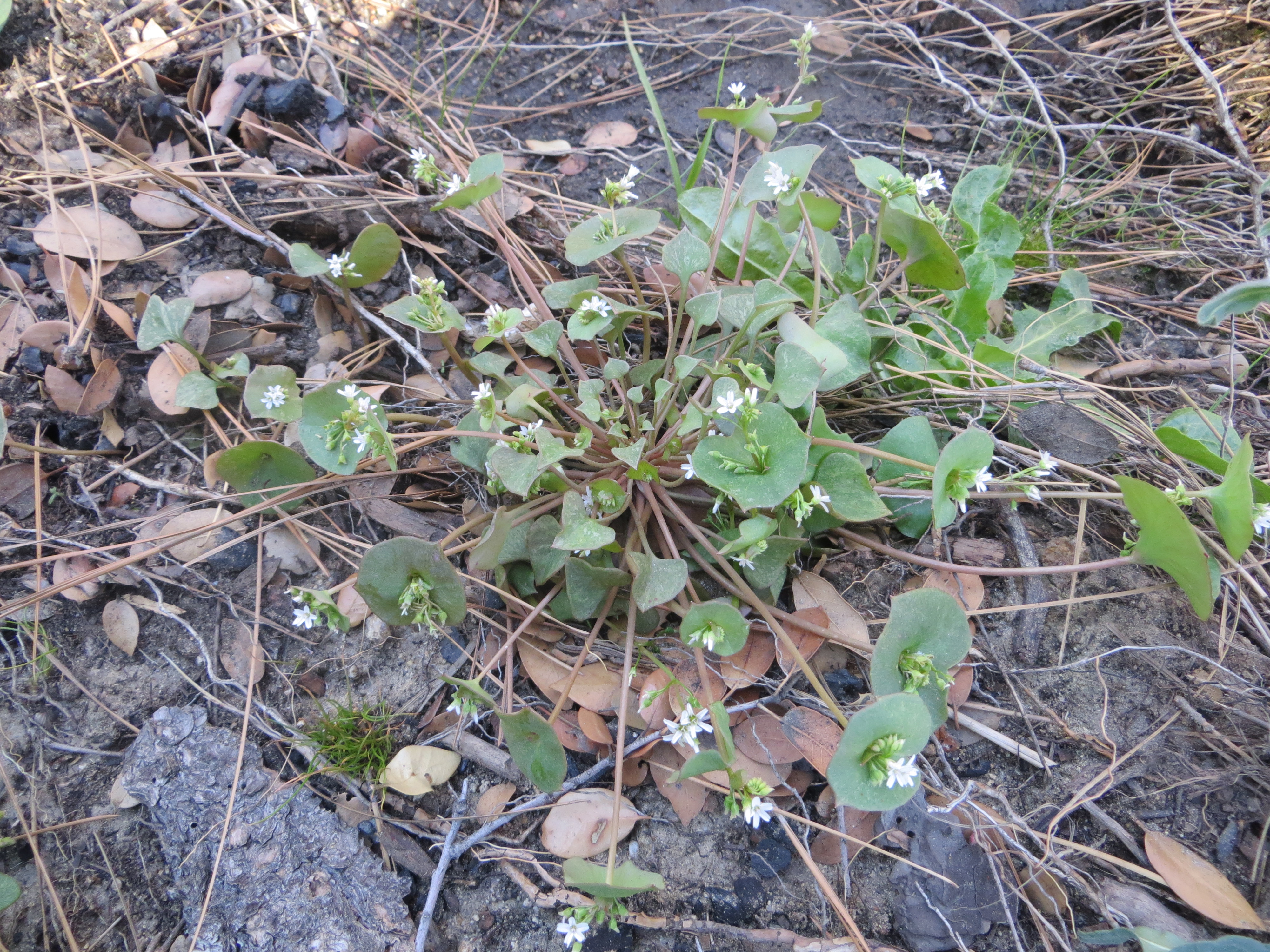 For effect, compare the leaves of Claytonia rubra plants in the above picture with the leaves of the plant in the picture immediately below, C. perfoliata, both of which were photographed at the Tejon Ranch in somewhat close proximity (either side of the same mountain ridge) — see how Claytonia perfoliata (below) tends to elevate its leaves off the ground?