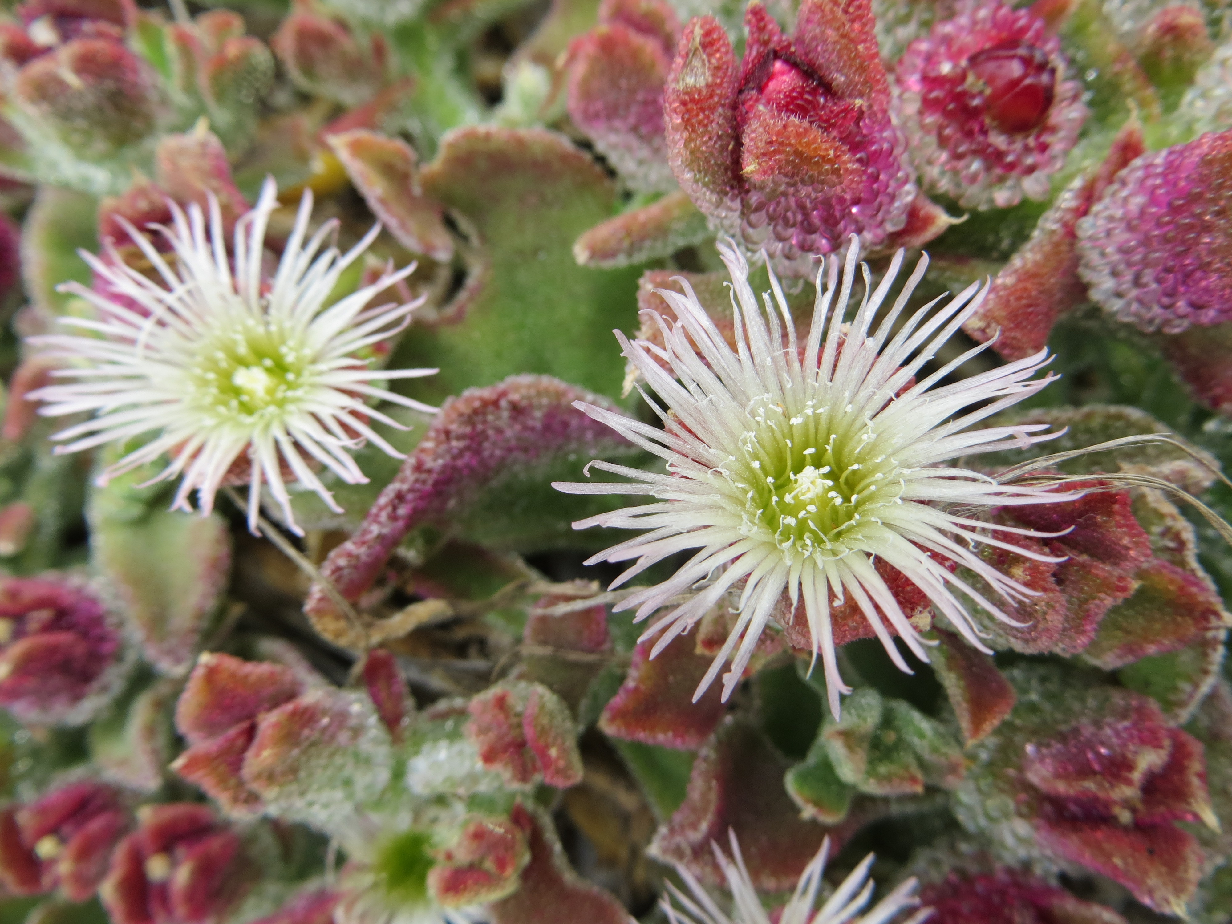[From left to right, Claytonia parviflora, C. perfoliata, and C. rubra!] Multiple miner’s lettuce species growing in sympatry in Mill Creek Canyon, San Bernardino Mountains, California.