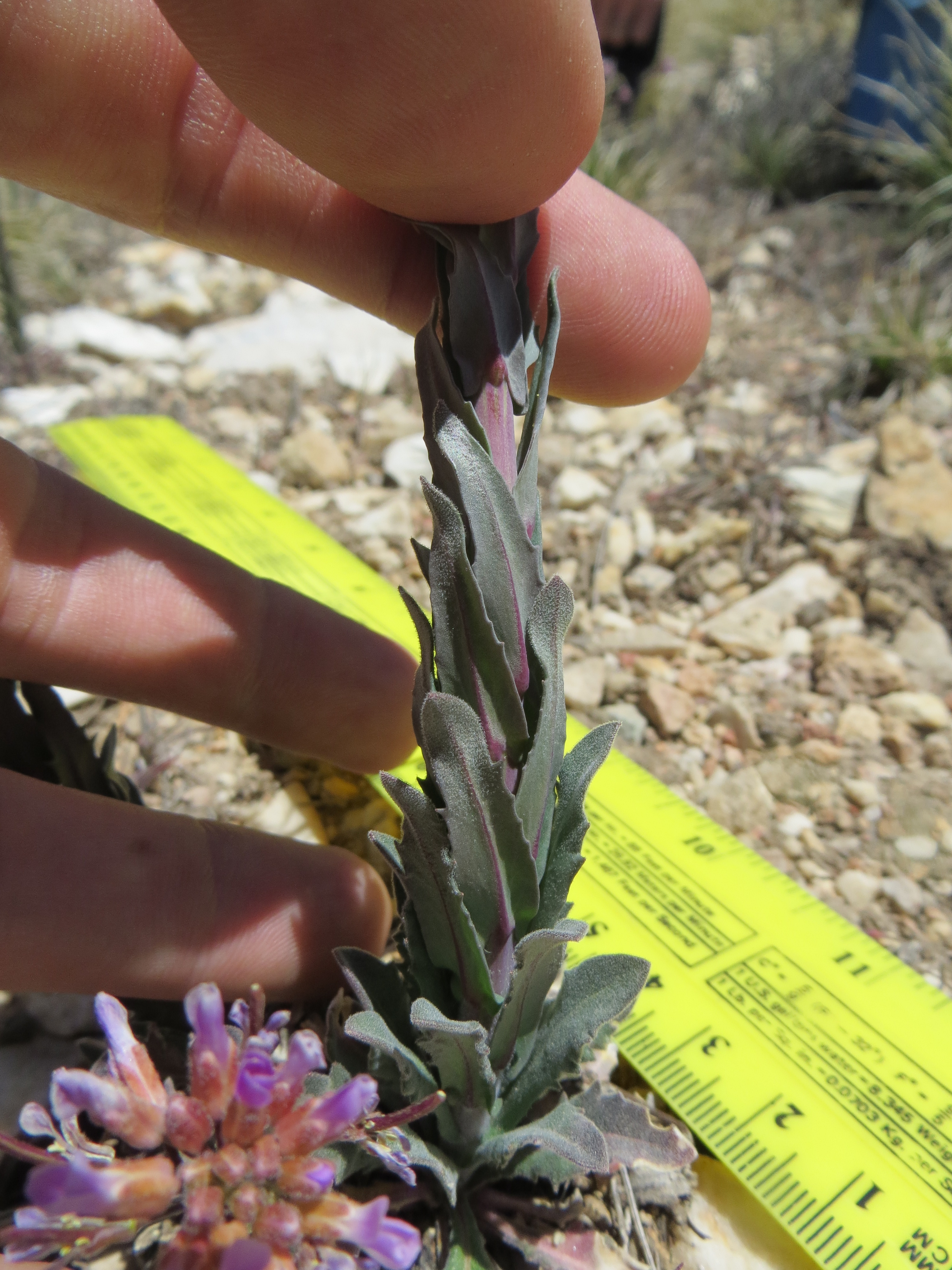 A typical rosette of Boechera “grossii”, generally with less silvery-canescent basal leaves and slightly dentate margins of leaf blades.