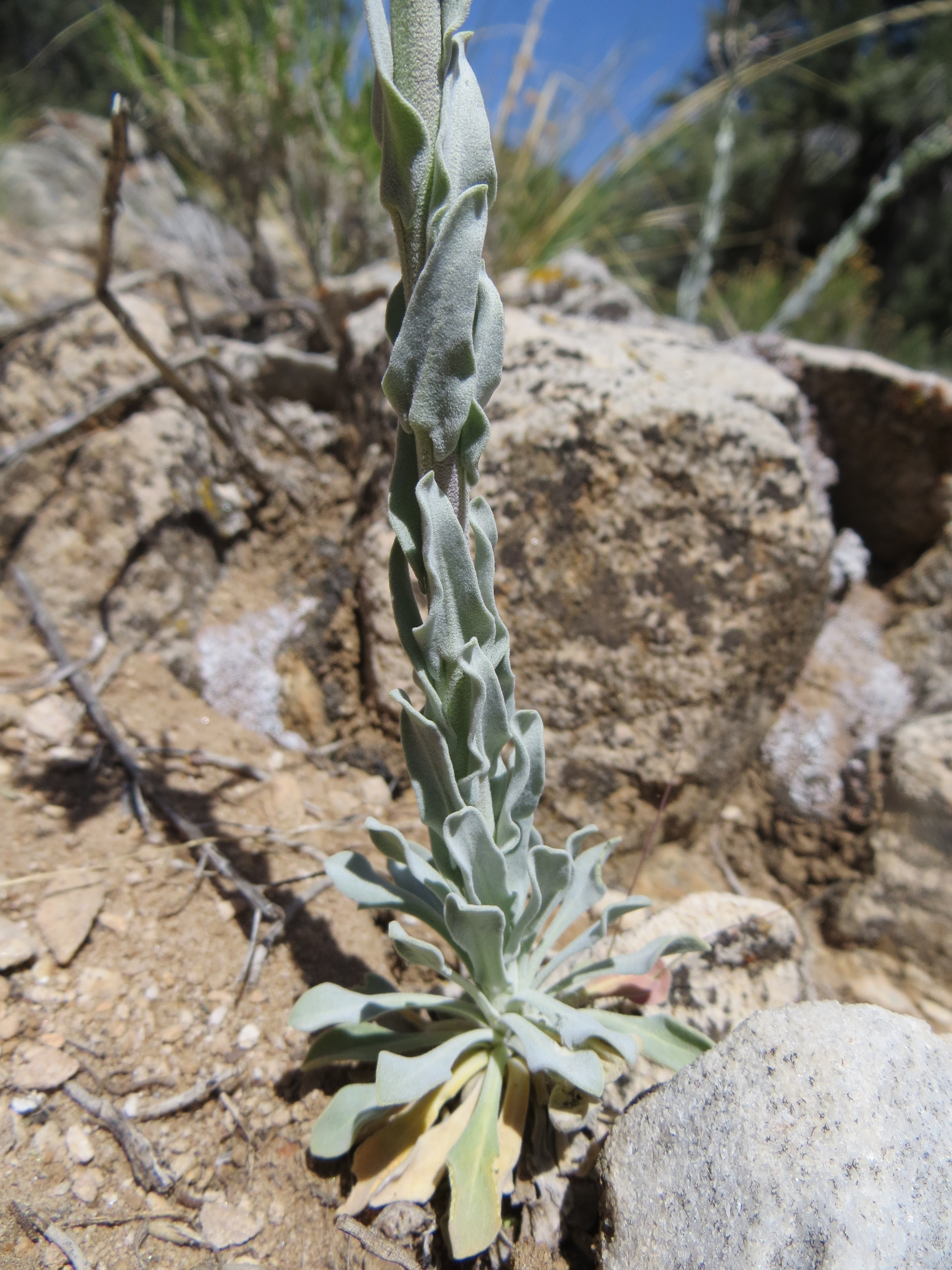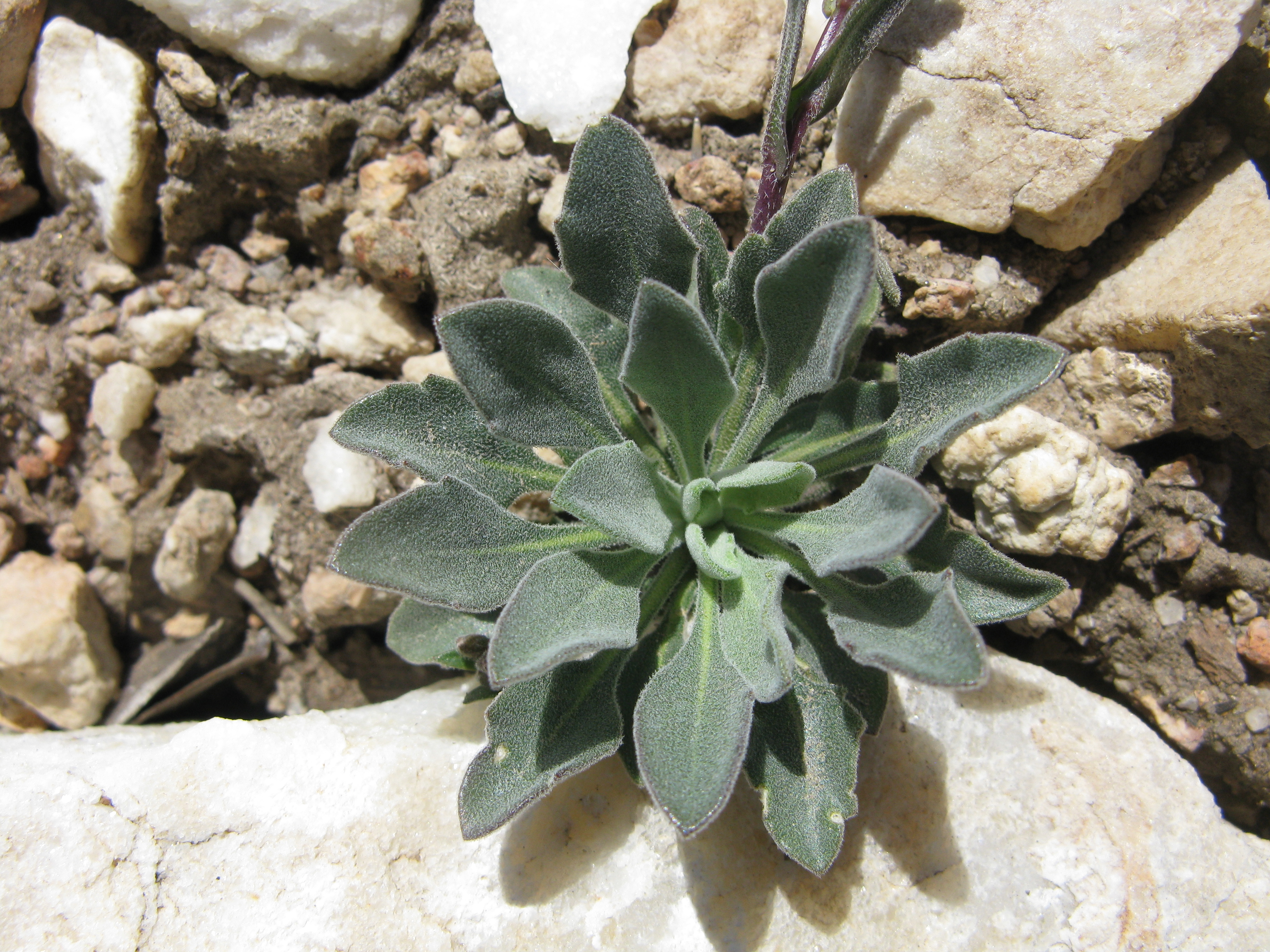 A group of rather typical rosettes of Boechera shockleyi, considerably more silvery-canescent than the limestone hybrid Boechera “grossii” and with strictly spatulate leaves.