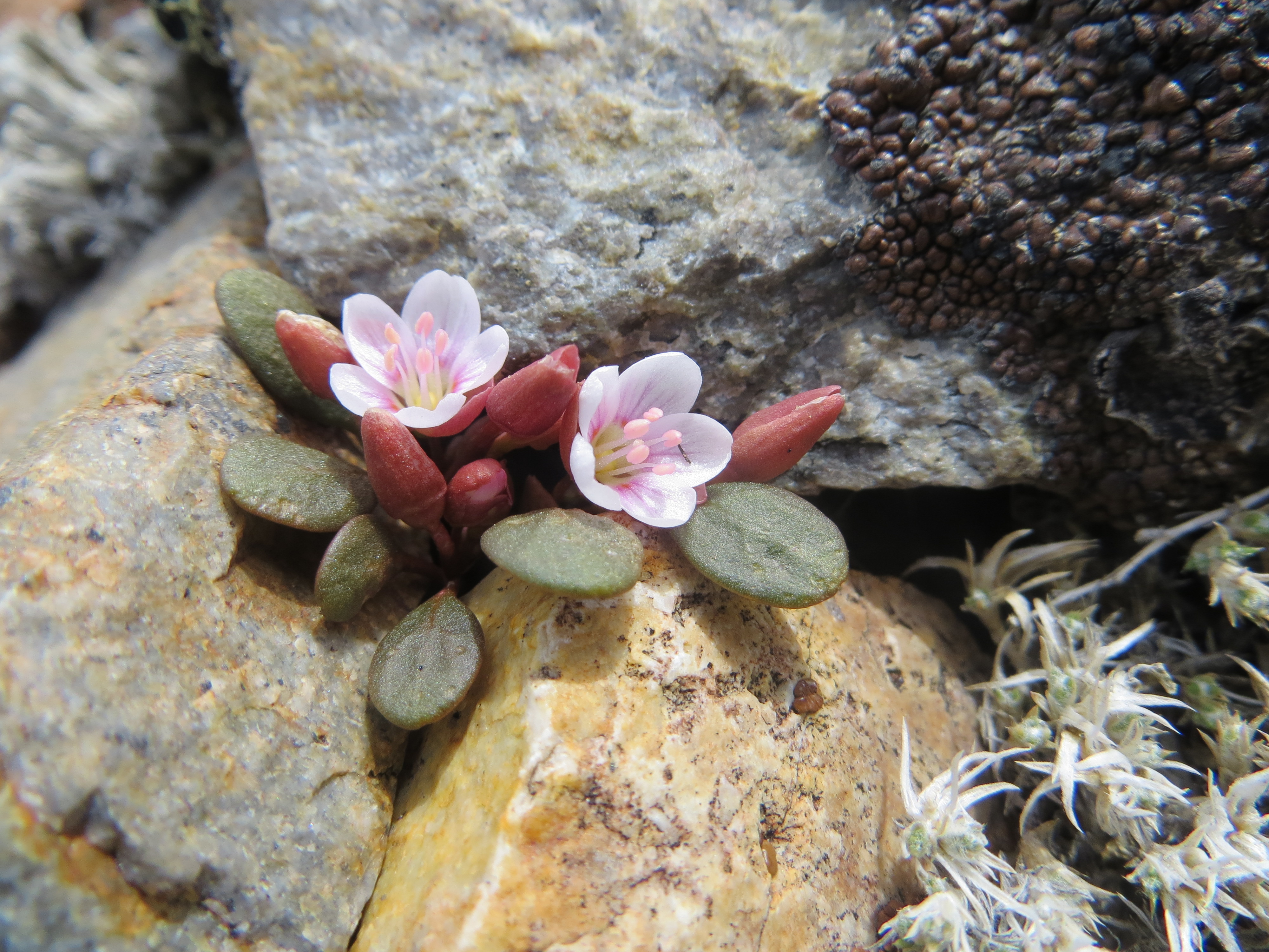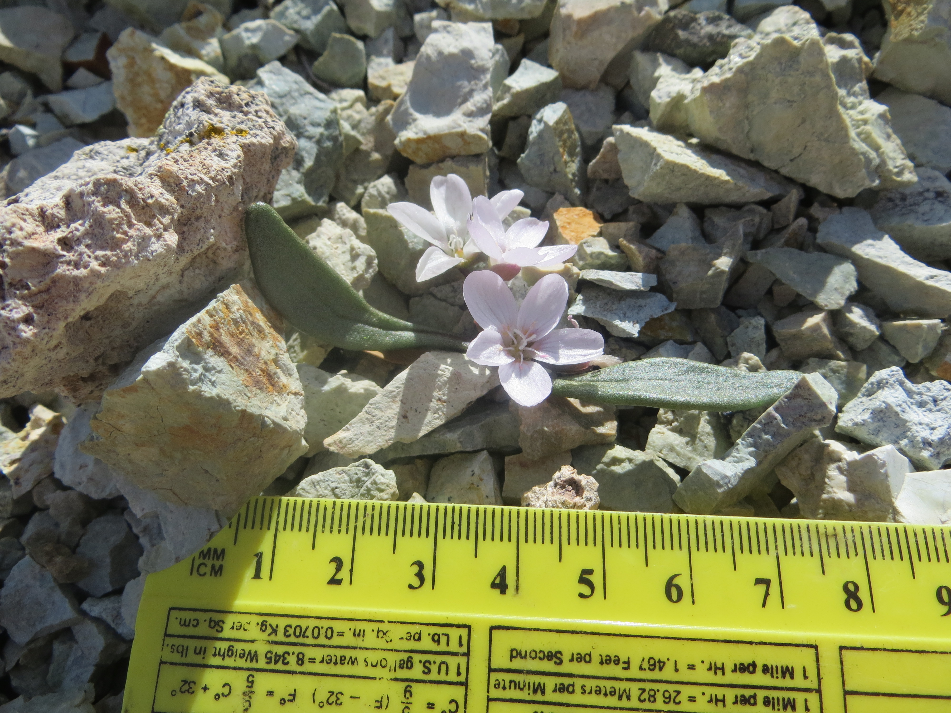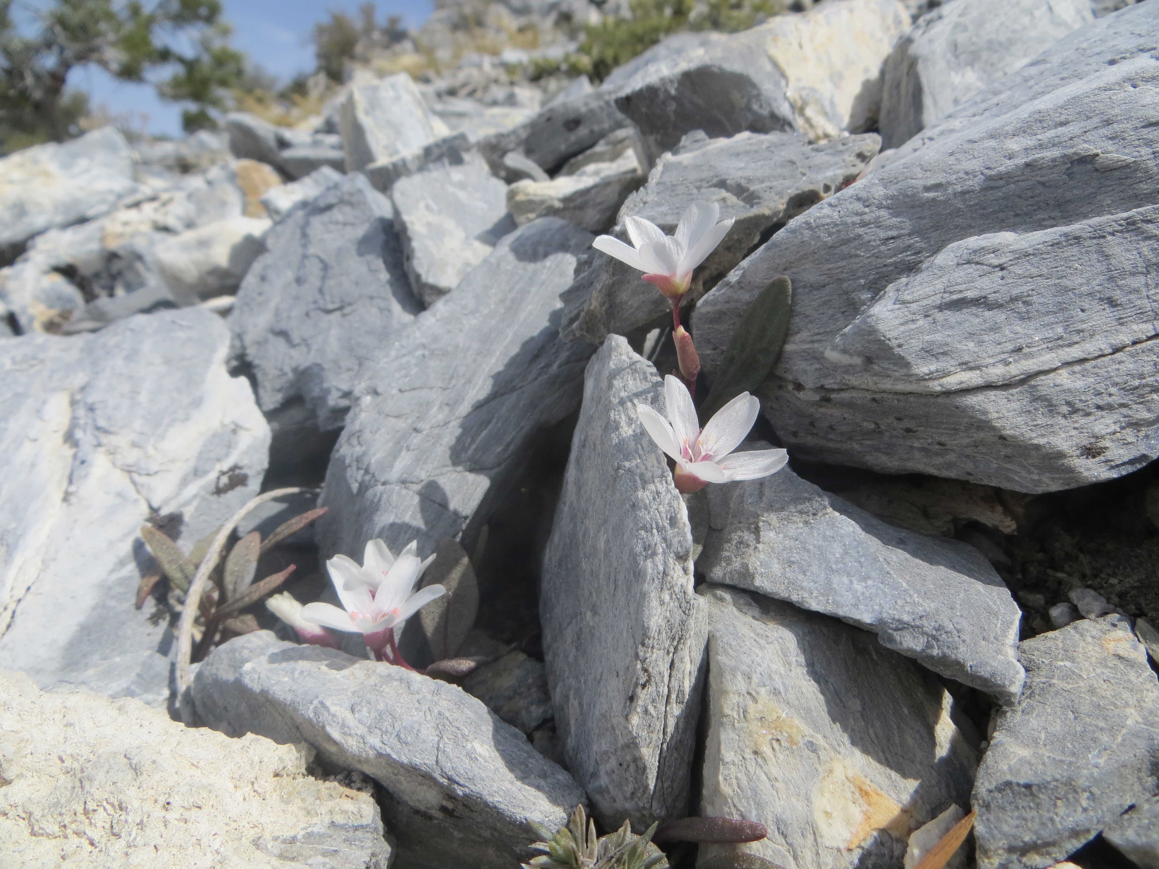 (Above) More Claytonia umbellata species complex from the Pine Nut Mountains at Bismark Peak, Nevada — thanks to Larry Crawford for the two photos above from this location. These plants knocked my socks off when I saw them for the first time — they grow in a very bizarre habitat of frost heaved ‘shingles’ of a sedimentary rock unlike anything I’ve seen for members of the complex. I’m still trying to work out the relationships (part of my dissertation research), but I suspect that C. umbellata is rather closely related to the C. “peirsonii” group.